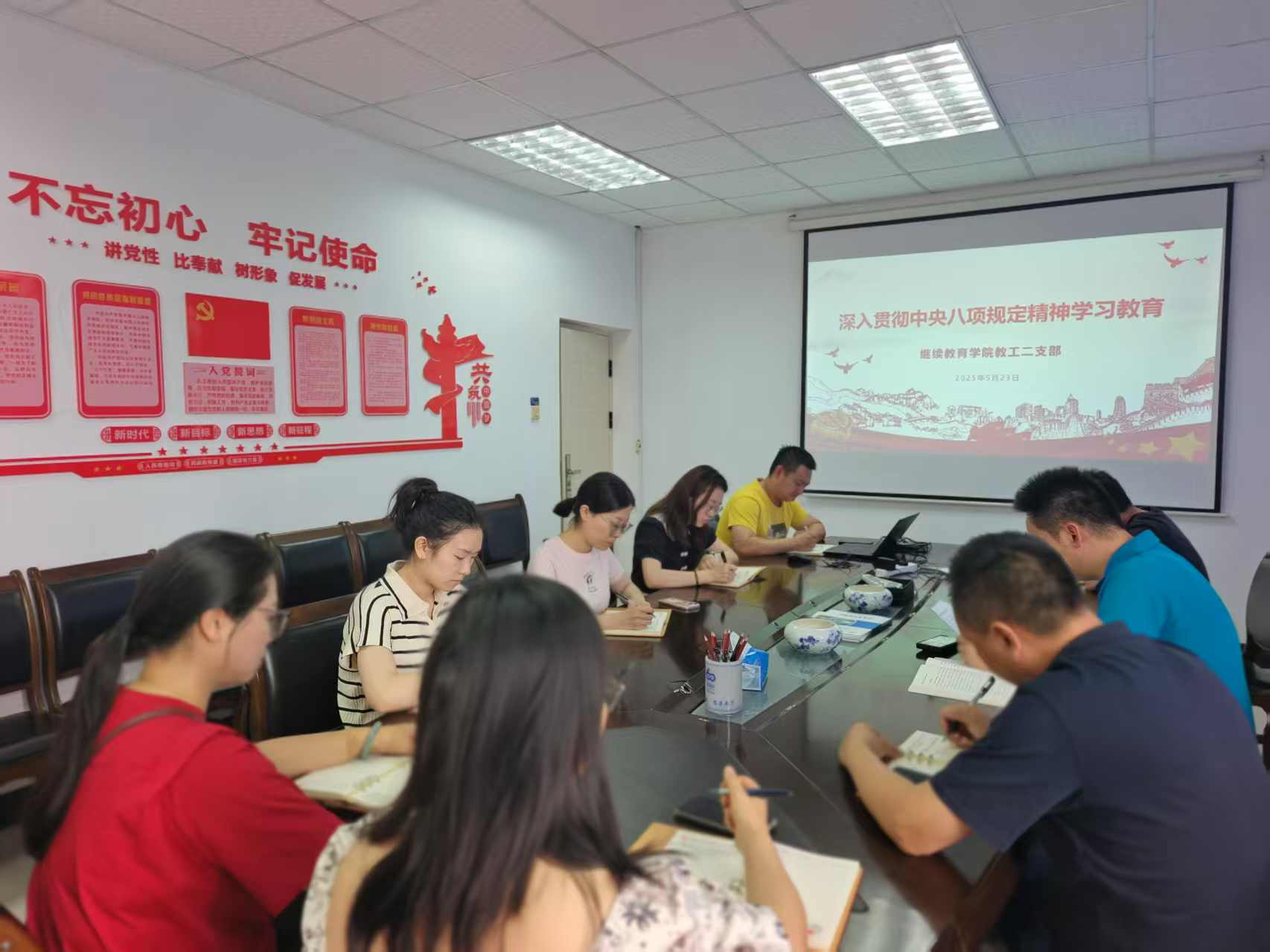2025年5月23日,继续教育学院教工二支部在学院二楼会议室召开了以“深入贯彻中央八项规定精神”为主题的支部学习会,旨在进一步加强支部党员的纪律意识和作风建设。