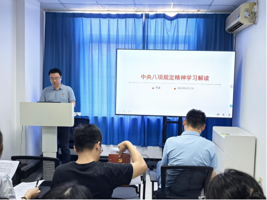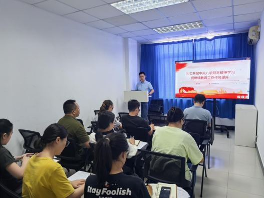 支部书记狄堃随后作《扎实开展中央八项规定精神学习促进继续教育工作作风提升》专题党课。通过剖析违规吃喝、超标接待等典型案例,生动揭示了形式主义、官僚主义、享乐主义和奢靡之风的具体表现及危害。立足继续教育发展实际,狄堃从教学管理、学生沟通、培训服务、生源拓展四个方面提出具体工作要求,并要求全体党员强化思想引领,严格行为规范,建立监督检查和持续改进的闭环工作机制。