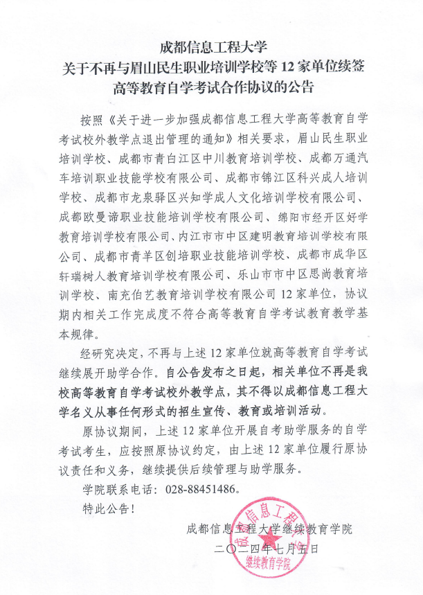 betway必威西汉姆联关于终止与眉山民生职业培训学校等12家单位高等教育自学考试合作助学的公告