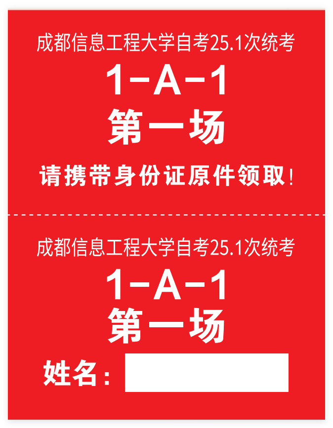 (2)号码牌为一式两联(上下联),考生存放时需在下联填写姓名,号码牌下联由工作人员贴在物品存放袋上,号码牌上联由考生自行保管。号码牌如下图所示: