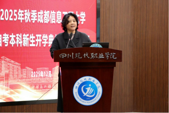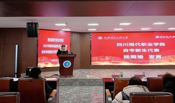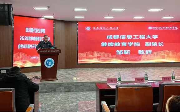 2025年12月4日,我校与四川现代职业学院联合举办“逐梦成信·启航未来”——betway必威西汉姆联2025年自考专升本开学典礼,典礼在四川现代职业学院学术报告厅隆重举行。我校继续教育学院副院长邹靳、自考科科长梁波,四川现代职业学院继续教育与培训学院院长唐建华、各二级学院党总支书记、教师代表及全体自考专升本新生出席。典礼由四川现代职业学院继续教育中心主任雷蕾主持。