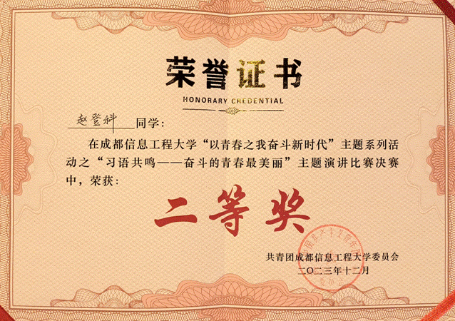 我院赵登科同学在"习语共鸣--奋斗的青春最美丽"主题演讲比赛决赛中,荣获二等奖。