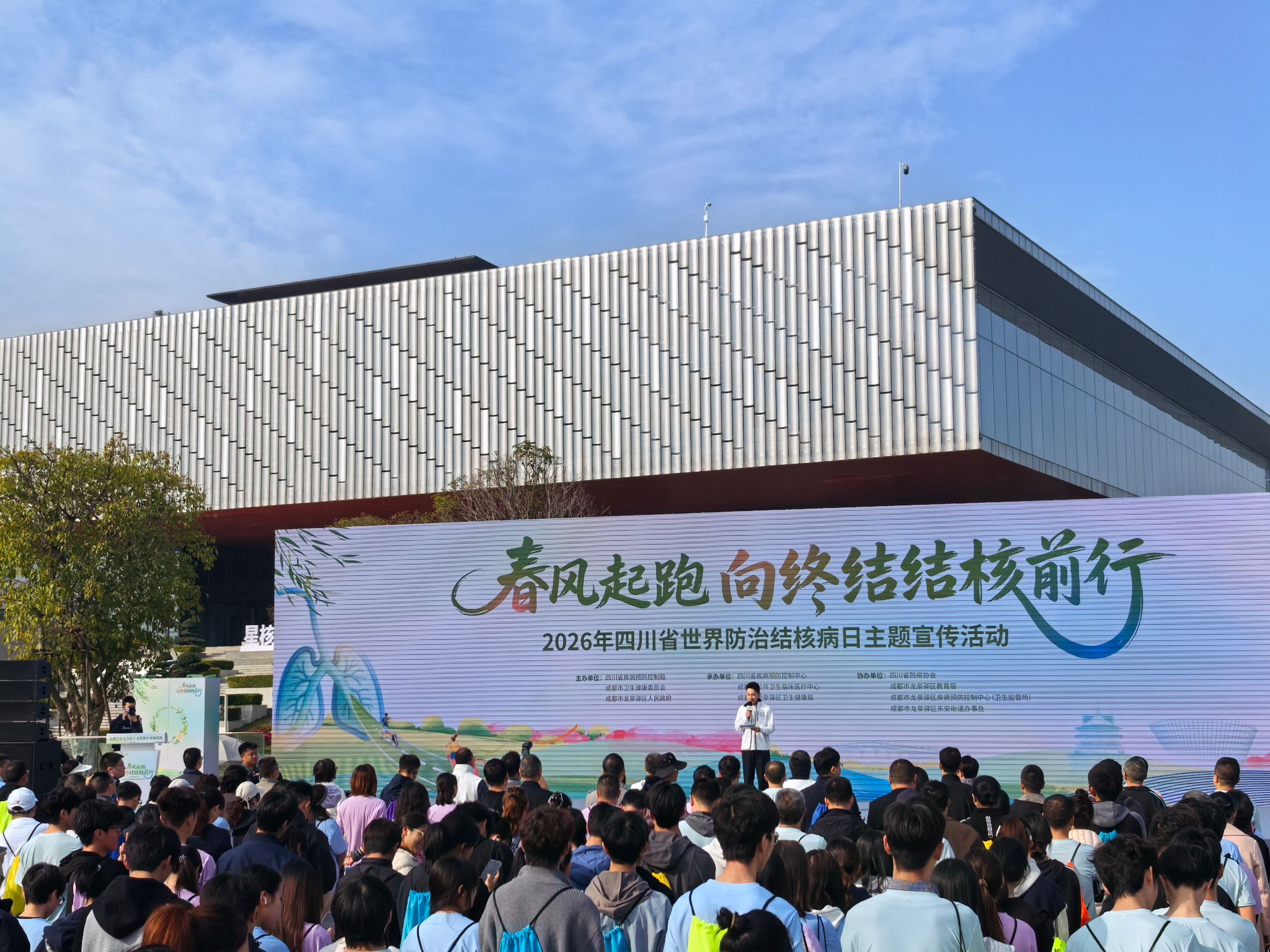四川省2026年“世界防治结核病日”主题宣传活动于3月24日在成都市龙泉驿区东安街道书香广场拉开帷幕。此次活动由四川省疾病预防控制局、成都市卫生健康委员会等单位联合主办,以“春风起跑,向终结结核前行”为主题,将健康跑与趣味科普互动相结合,凝聚社会各界力量,共筑结核病防控防线。来自四川师范大学、成都大学、四川财经职业学院、成都航空职业大学、国际标榜职业学院、四川旅游学院等11所高校的200多名选手参加本次比赛,我院精心选拔20名学生代表学校,全程参与活动,以青春担当传递健康理念。