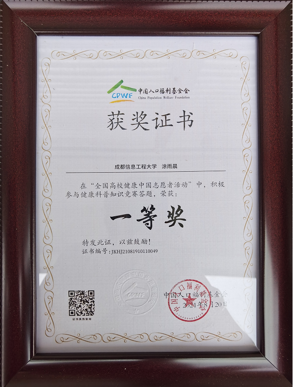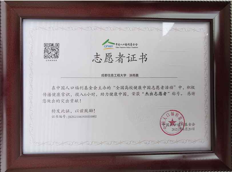 值此建党百年和十四五开局之年,为让更多的青年关注健康问题,普及健康常识,中国人口福利基金会携手国青实践联合发起“全国高校健康中国志愿者活动”。我校继续教育学院学生涂雨晨积极传播健康知识投入超过6小时,并积极参与健康科普知识竞赛答题,经官方审核通过,荣获“杰出志愿者”称号、获得竞赛答题“一等奖”。