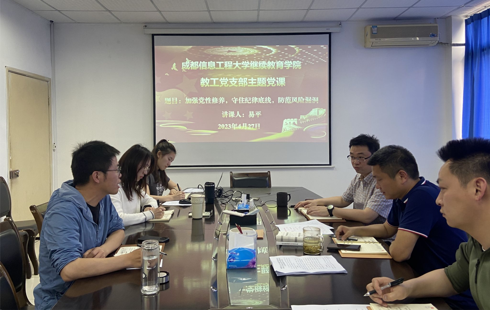 为更好的贯彻落实习近平新时代中国特色社会主义思想,持续开展思想主题教育,4月27日,继续教育学院党委书记易平同志为教工党支部全体党员讲主题教育党课,题目:加强党性修养,守住纪律底线,防范风险漏洞。