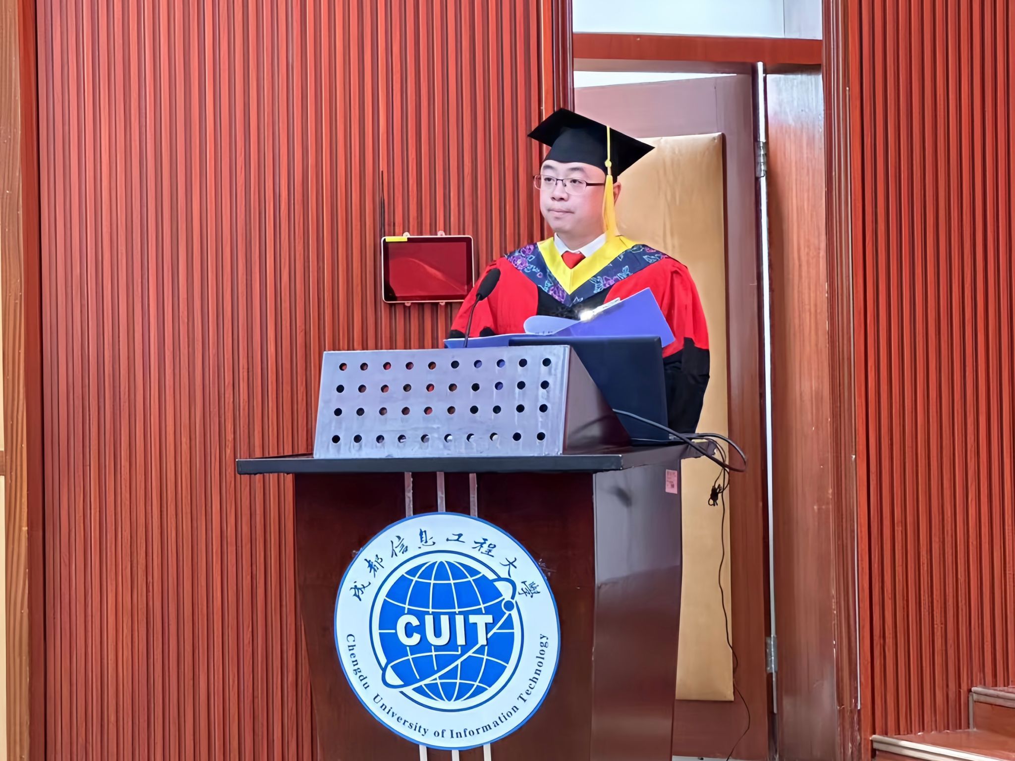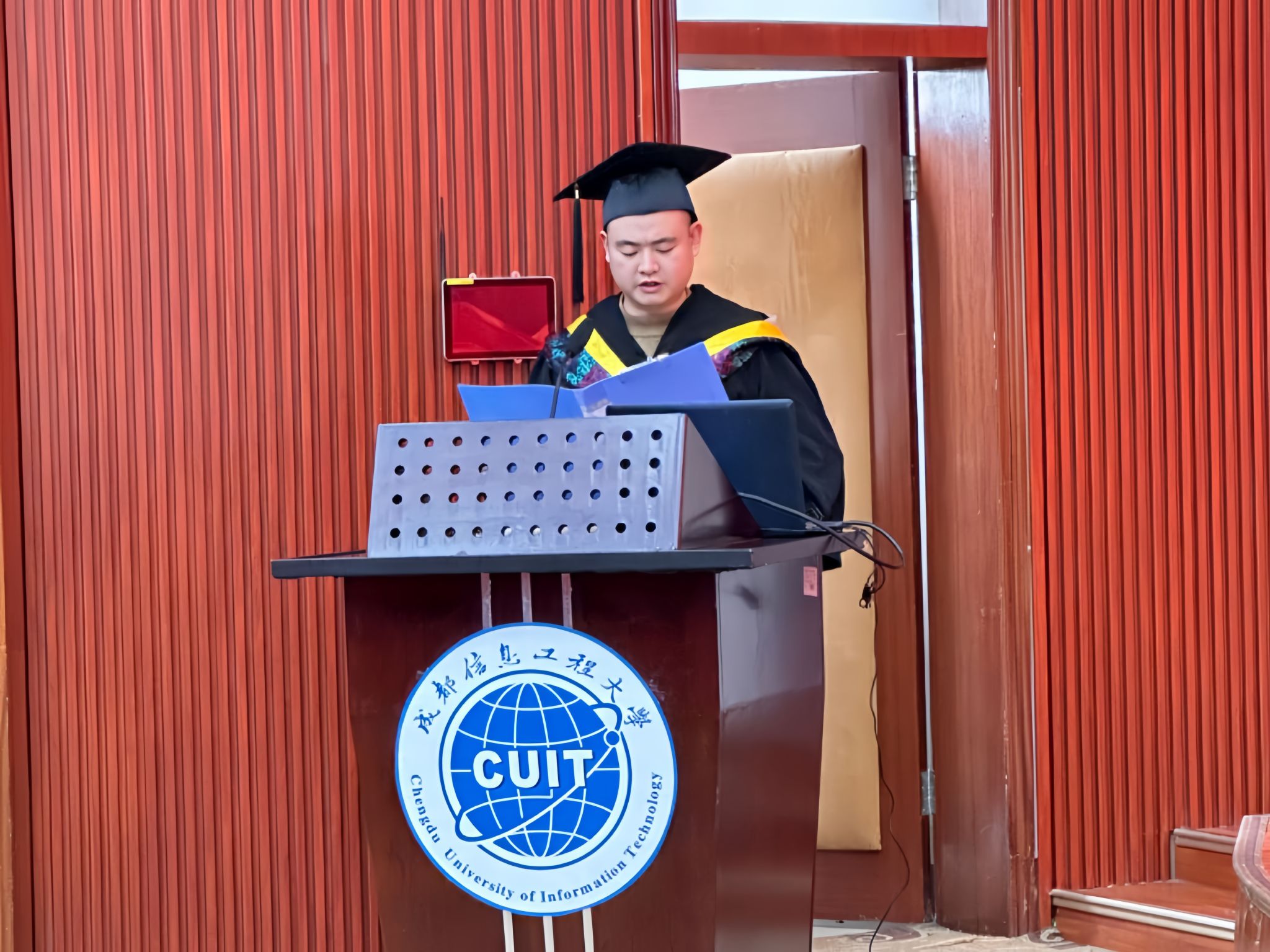 党委书记易平致辞向获得学位的同学表示热烈祝贺。他希望全体毕业生以“终身学习”迎接未来挑战,以“实干笃行”开创美好生活,以“成信精神”勇闯人生之路。