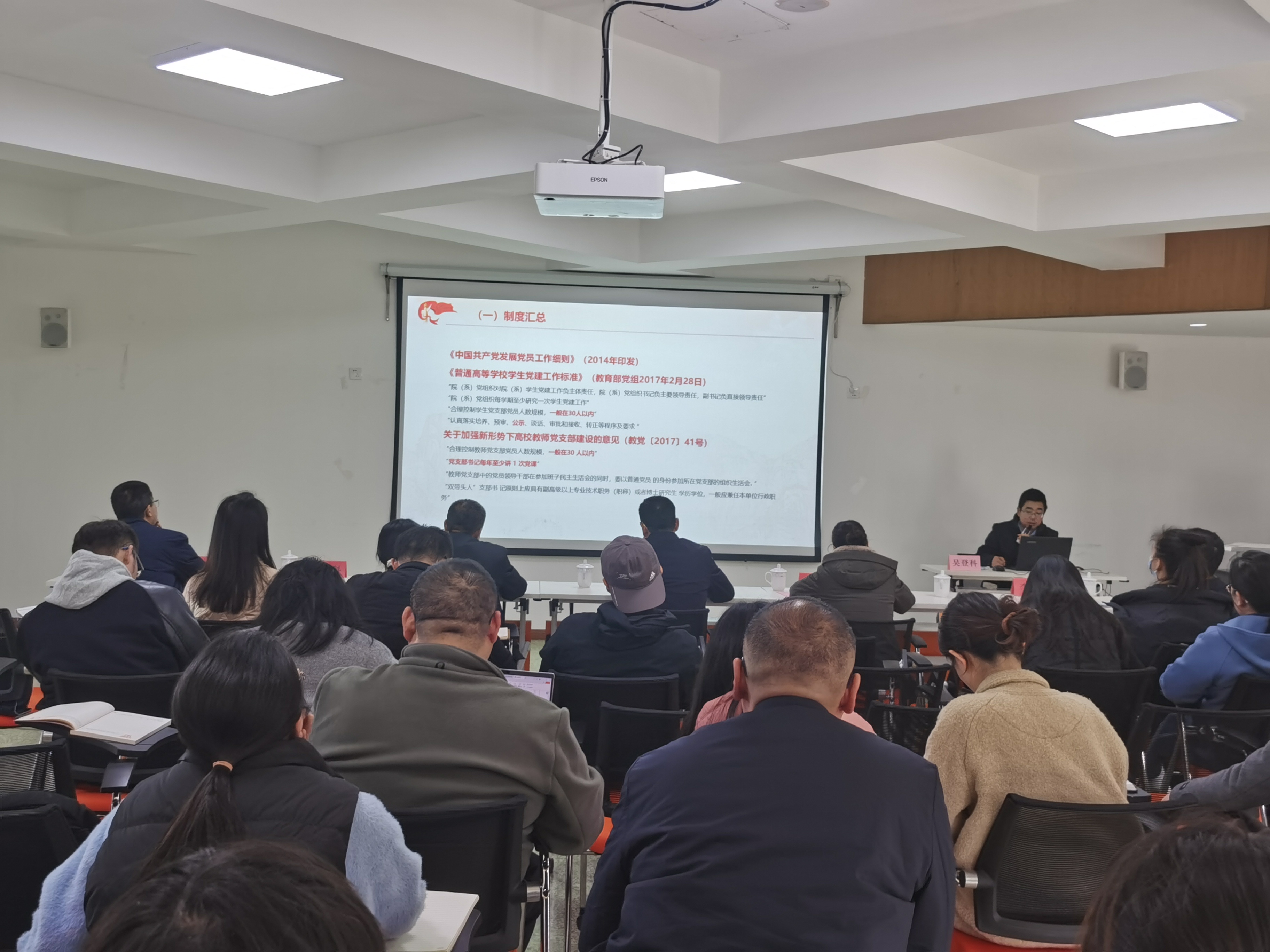 大气科学学院党委副书记吴登科以《做好党支部工作的思考》为题,围绕基层党支部工作标准化规范化建设工作,从制度要求、工作内容和具体实践三个方面做了专题培训,结合工作实际,对发展党员工作细则、如何落实“三会一课”制度进行了详细讲解。