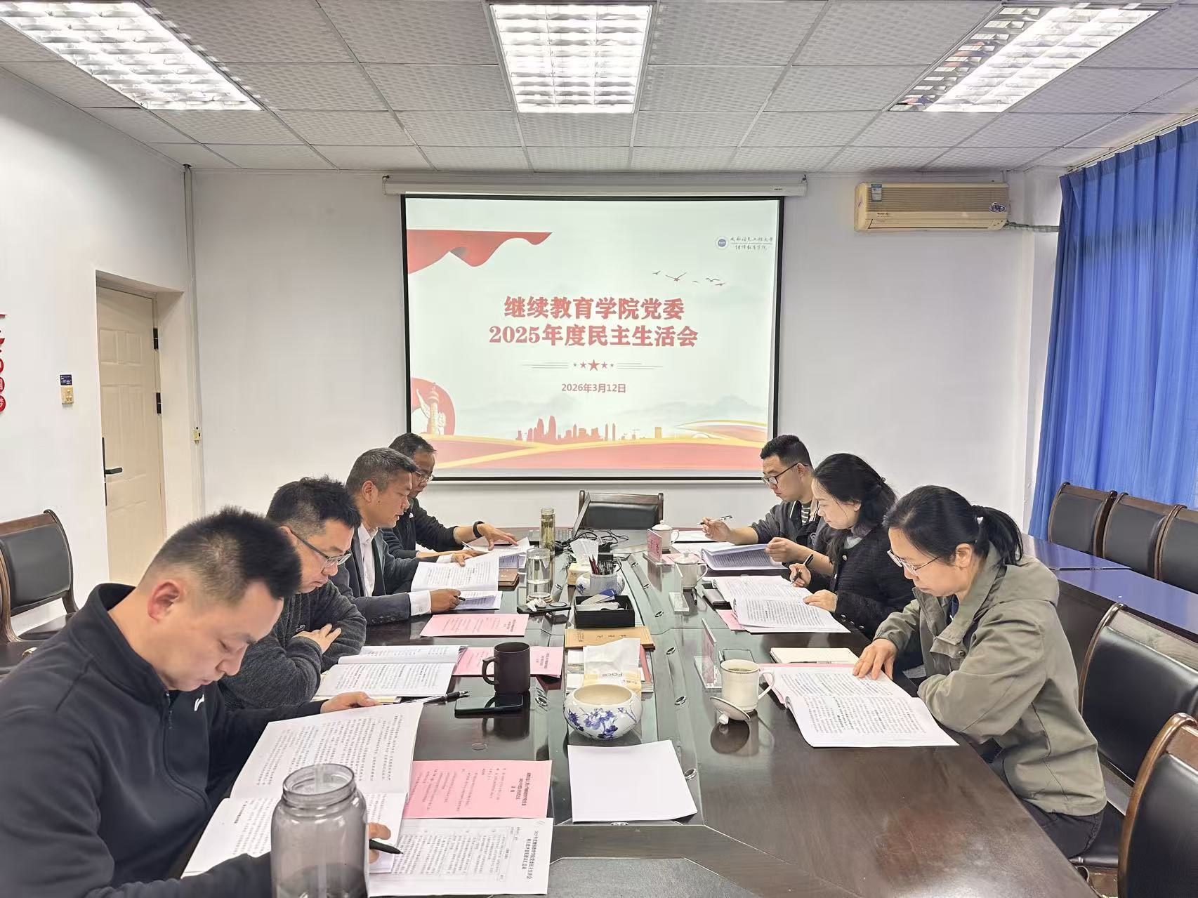 3月12日上午,继续教育学院党委在学院二楼会议室召开2025年度民主生活会。学校督导组丁恒康、孔晋红、于尧到会指导,参加会议的有学院党委书记易平,党委副书记、院长周鑫,副院长邹靳、狄堃,学院党委委员李海林、吕礼、王韶鸿列席会议,会议由学院党委书记易平主持。